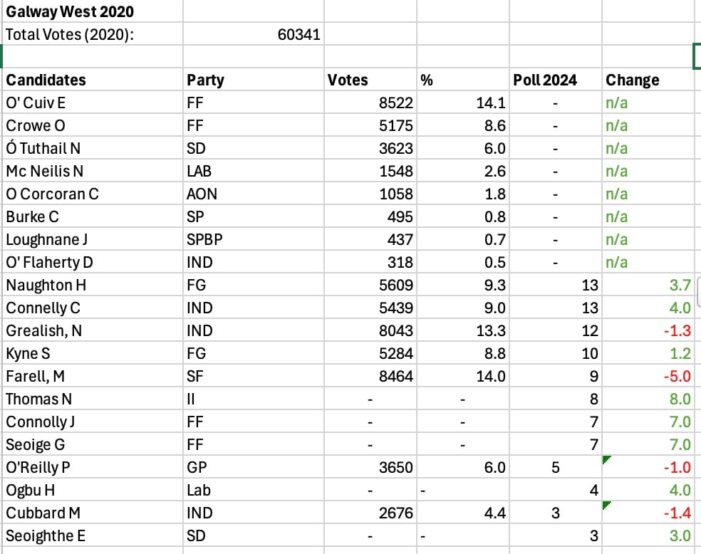 TG4 released a poll on the Galway West constituency. It revealed that running two FF candidates against a recently quit FF candidate (now Independent Ireland) was not the best method of converting any of those candidates into a FF TD. But behind that headline, it showed that the only sitting candidate to lose more support than the margin of error was SF's.