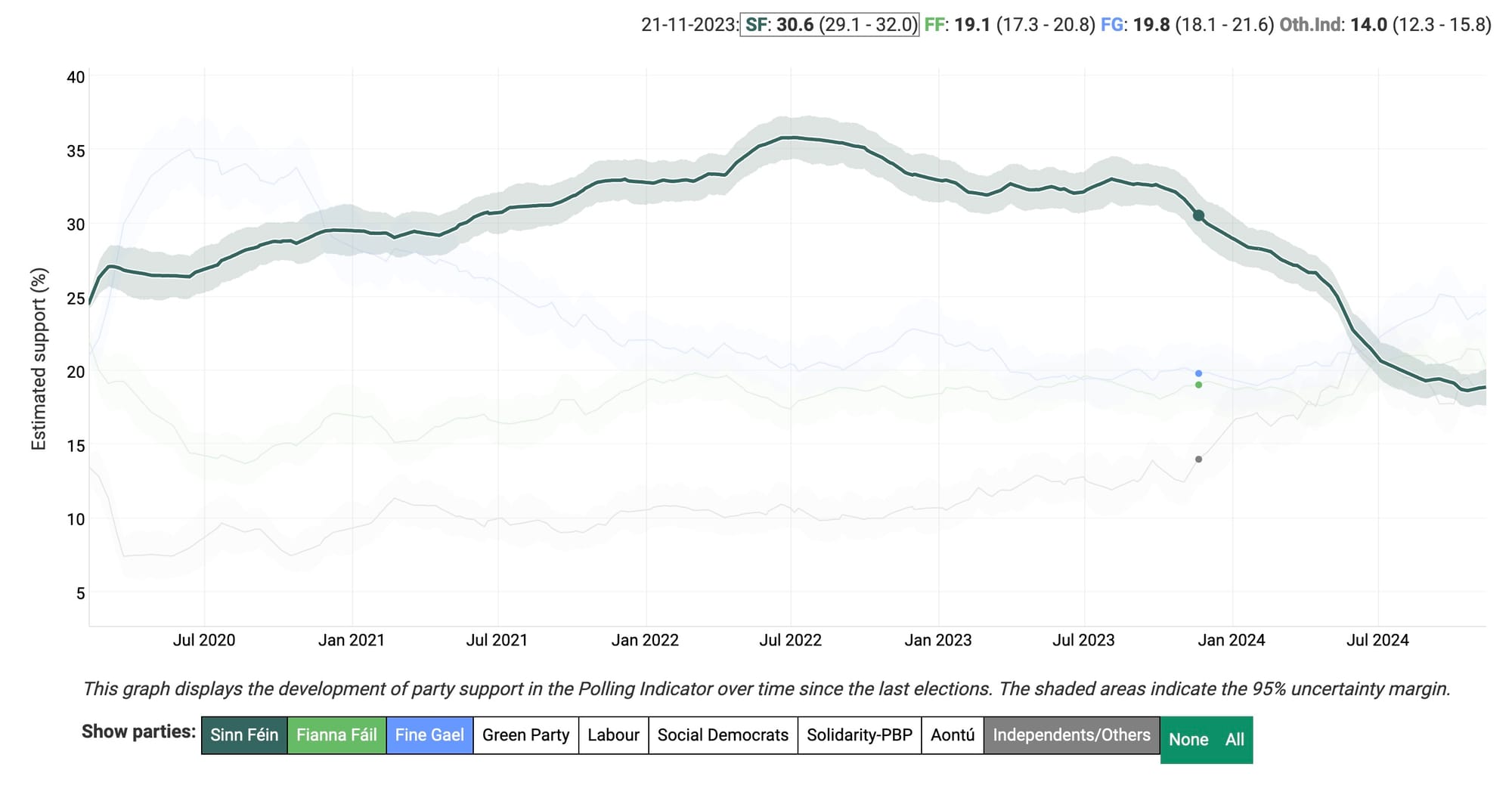 But, relevant to today's campaign launch of their immigration policy, the riot -and their subsequent reaction to it- marked the moment that Sinn Féin's polling went from slow drift down to sudden and sustained plummet from the top. On the 21st November 2023, SF were topping the opinion polls with an average of 30.6% support. By the 13th November 2024 (yesterday) that sat at 18.9%. In between those two dates, the ostensibly left-wing party has frantically been signalling they could be hostile to foreigners too.