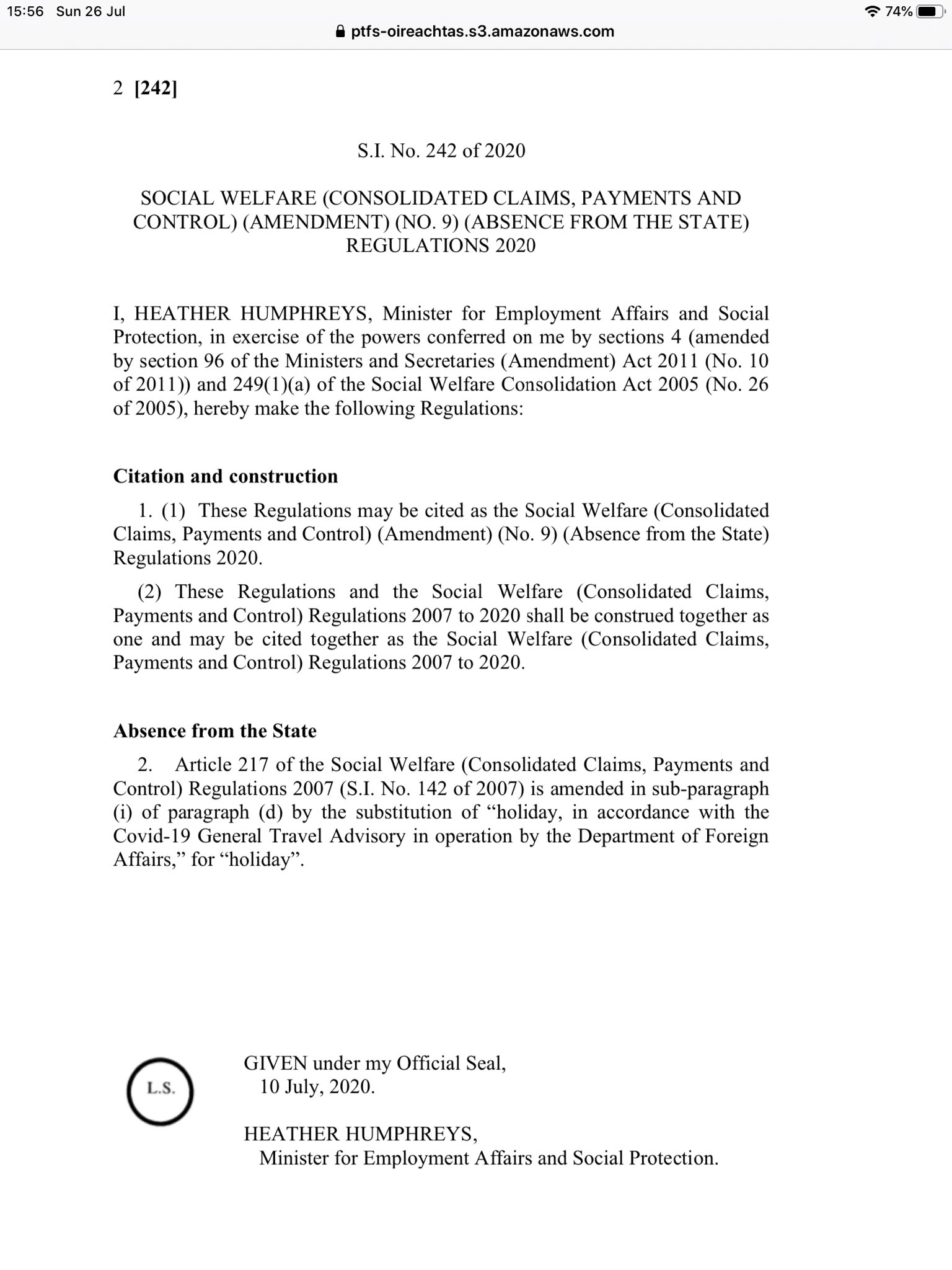 On the 10th July, without bothering to let anyone know, the Minister for Social Protection had signed a Ministerial Order that amended legislation dating back to 2007. That was a law, which said that you could take a 2 week holiday and still get your jobseekers allowance.