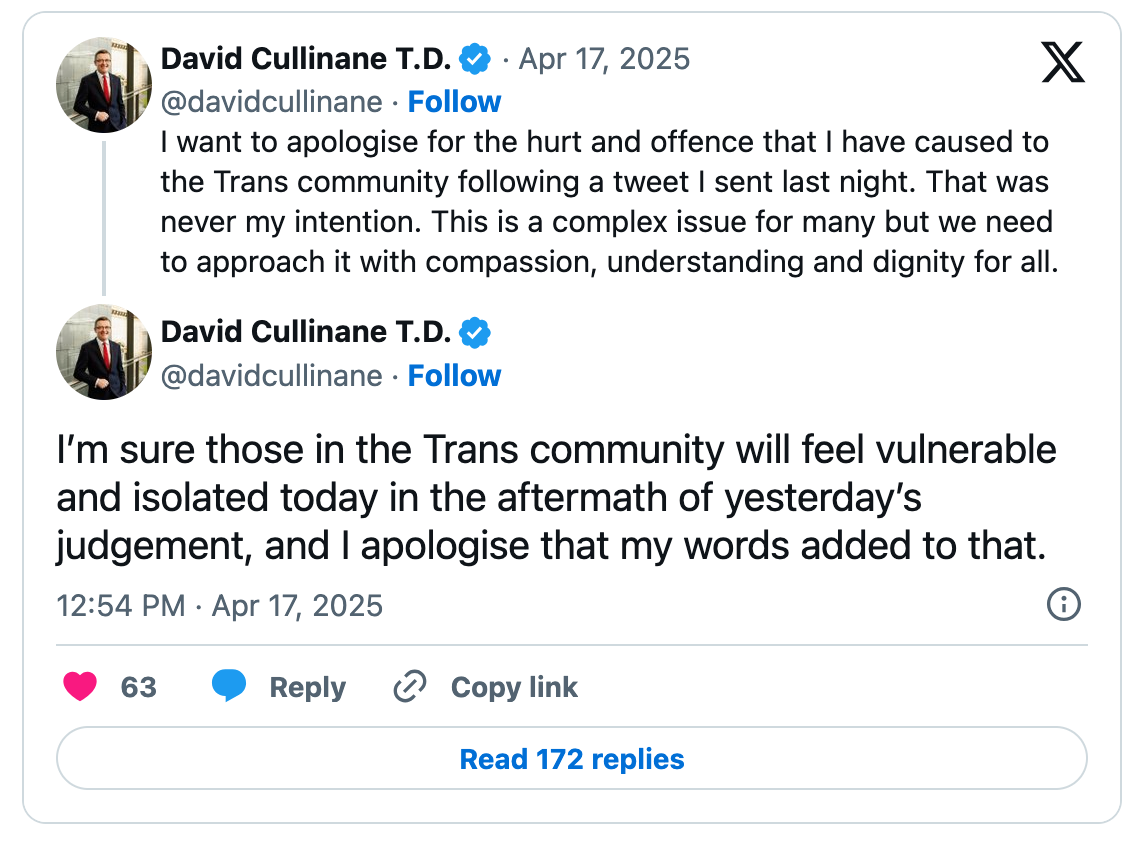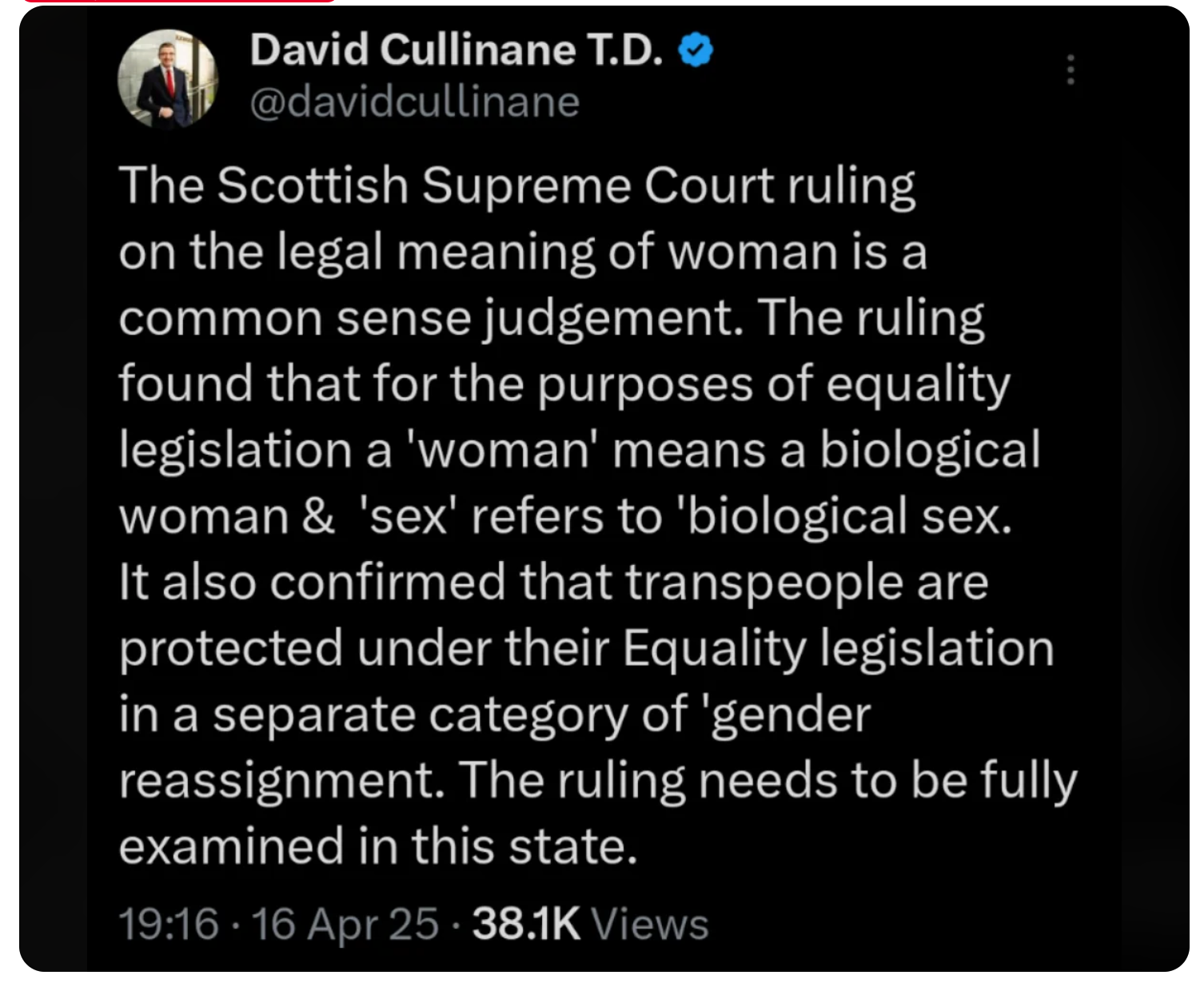Firstly, the ruling was not on the 'legal meaning of woman' outside of a single Act. See Paragraph 2 of the judgment quoted above, if you can remember that far back in your life. What is more striking is that the SF TD for Waterford thought he should welcome a decision of Britain's Supreme Court, hailing it as 'common sense judgment' and saying 'The ruling needs to be fully examined in this state'.