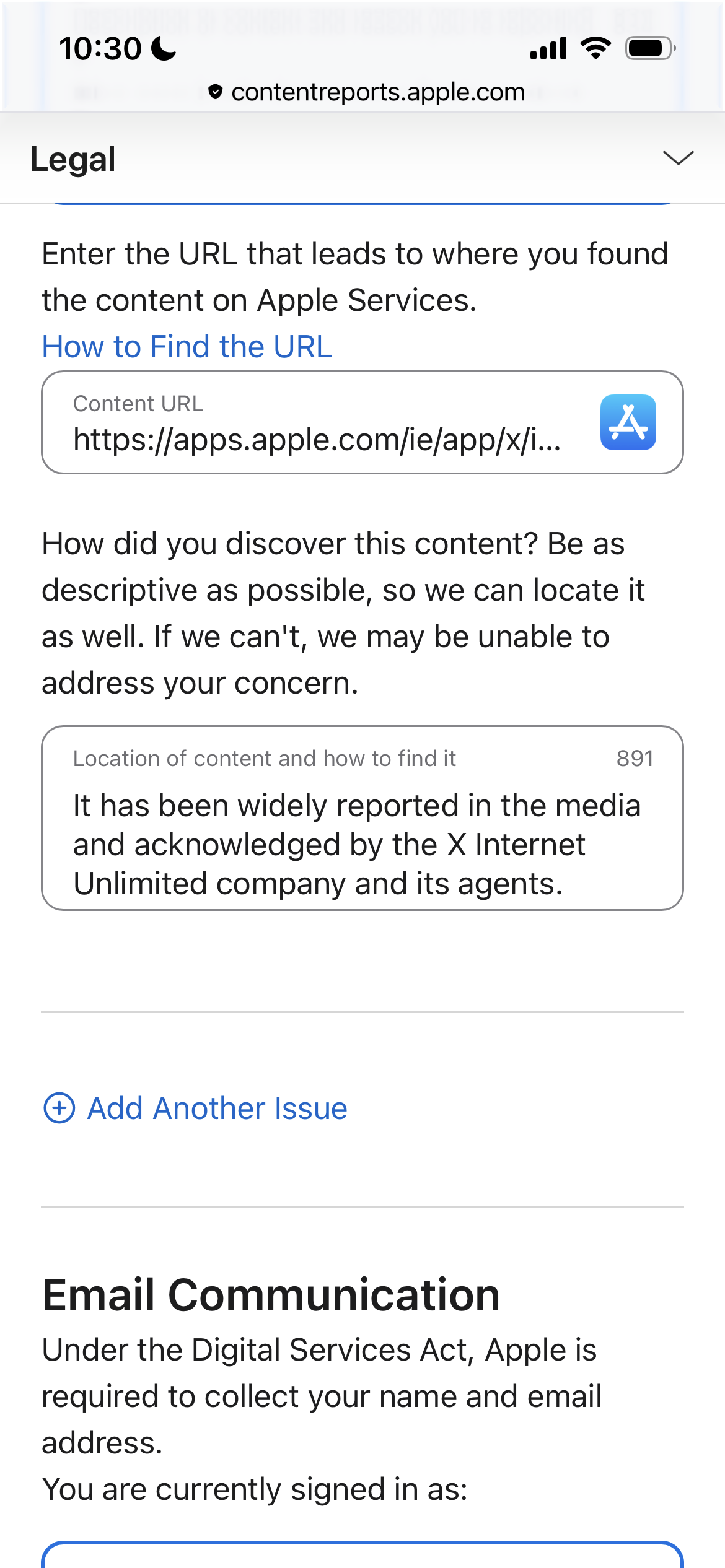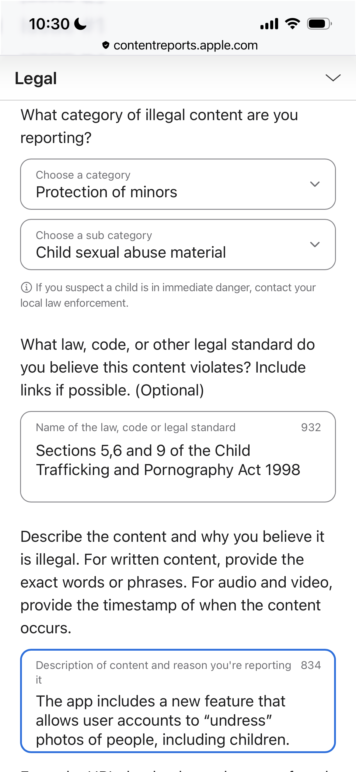 Then fill out the form. Here are some screenshots of my report to Apple to get you started. You'll also need to paste in the URL of the App. You get that by clicking the "Share" icon in the top right hand side of its page. It looks like a square with an arrow flying up out of it. Then tap "copy link" (or sometimes "copy URL"). Paste that URL into your complaint when they ask you for it.