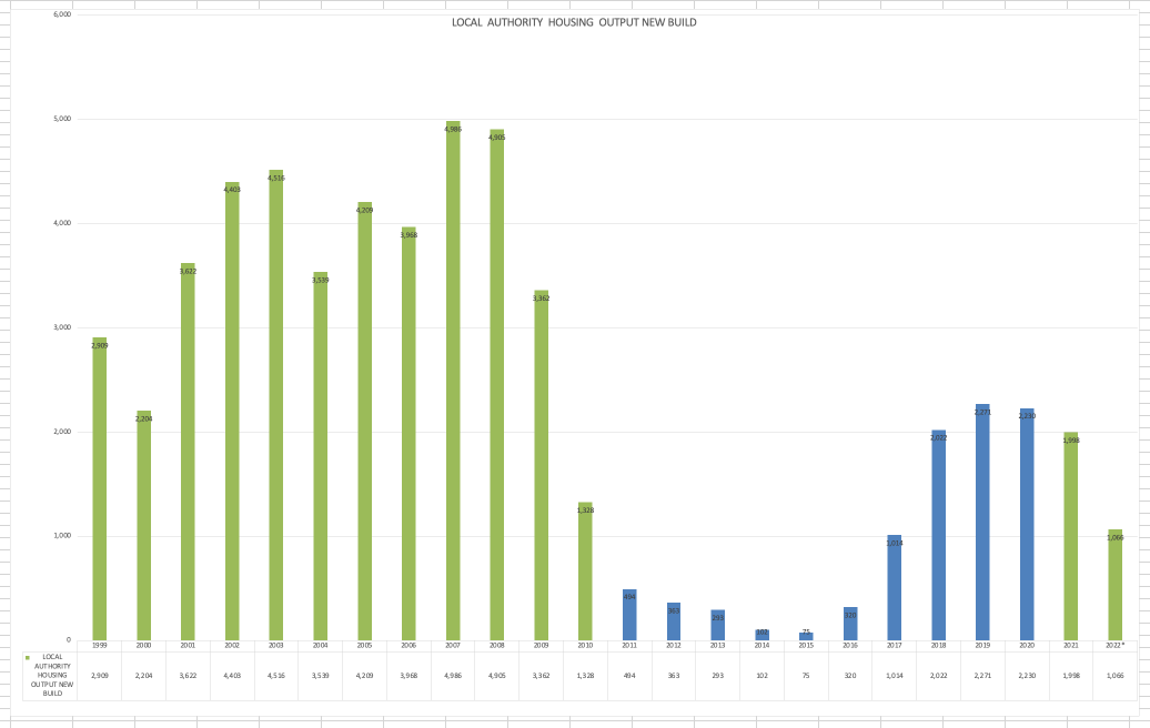 This chart shows the delivery of Local Authority house-building from 1999 to Q3 of 2022, the most recent figures available. They basically just stopped building at anything like the historical numbers as soon as Fine Gael became the largest party in the state. They have never recovered. They have actually been trending down since 2019. (Green Bars, years mostly led by FF Taoiseach. Blue Bars mostly led by FG Taoiseach)